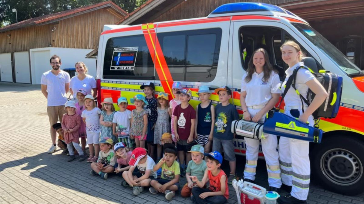 Ein besonderes Highlight des Tages war der Besuch der Ambulanz Rosenheim, die mit einem echten Krankenwagen vor Ort war. Die Kinder hatten die Möglichkeit, das Fahrzeug genau zu erkunden und Fragen zu stellen. Diese Erfahrung trug erheblich dazu bei, Ängste abzubauen und den Kindern zu zeigen, dass sie in Notsituationen keine Angst haben müssen.