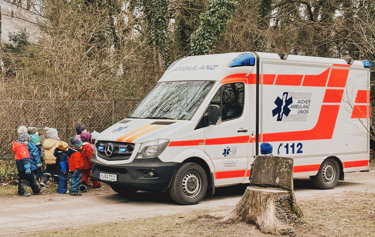 Wir bedanken uns beim Kindergarten für die Einladung und die herzliche Zusammenarbeit bei diesem Projekt. Auch bedanken wir uns bei der Aicher Ambulanz für den uns zur Verfügung gestellten Rettungswagen.