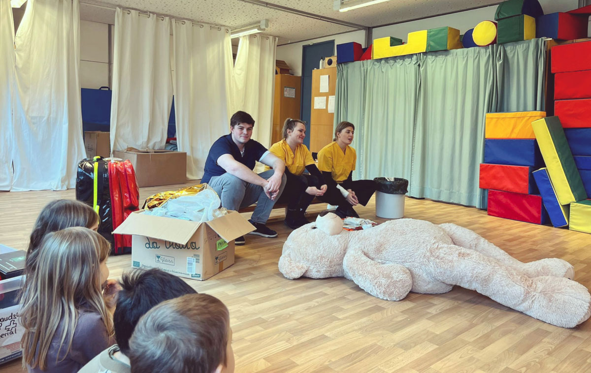 Das Team, bestehend aus Sophia und den beiden Notfallsanitäter-Azubis Kati und Jonathan war positiv überrascht, wie schnell die Kinder vor allem die stabile Seitenlage praktisch anwenden konnten.